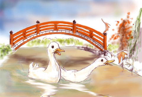 のんびり泳ぐアヒル達です。 葉っぱを追いかけてるのが、ピーちゃん。 首筋を伸ばしてシャンとしてるのが、アーちゃんです。